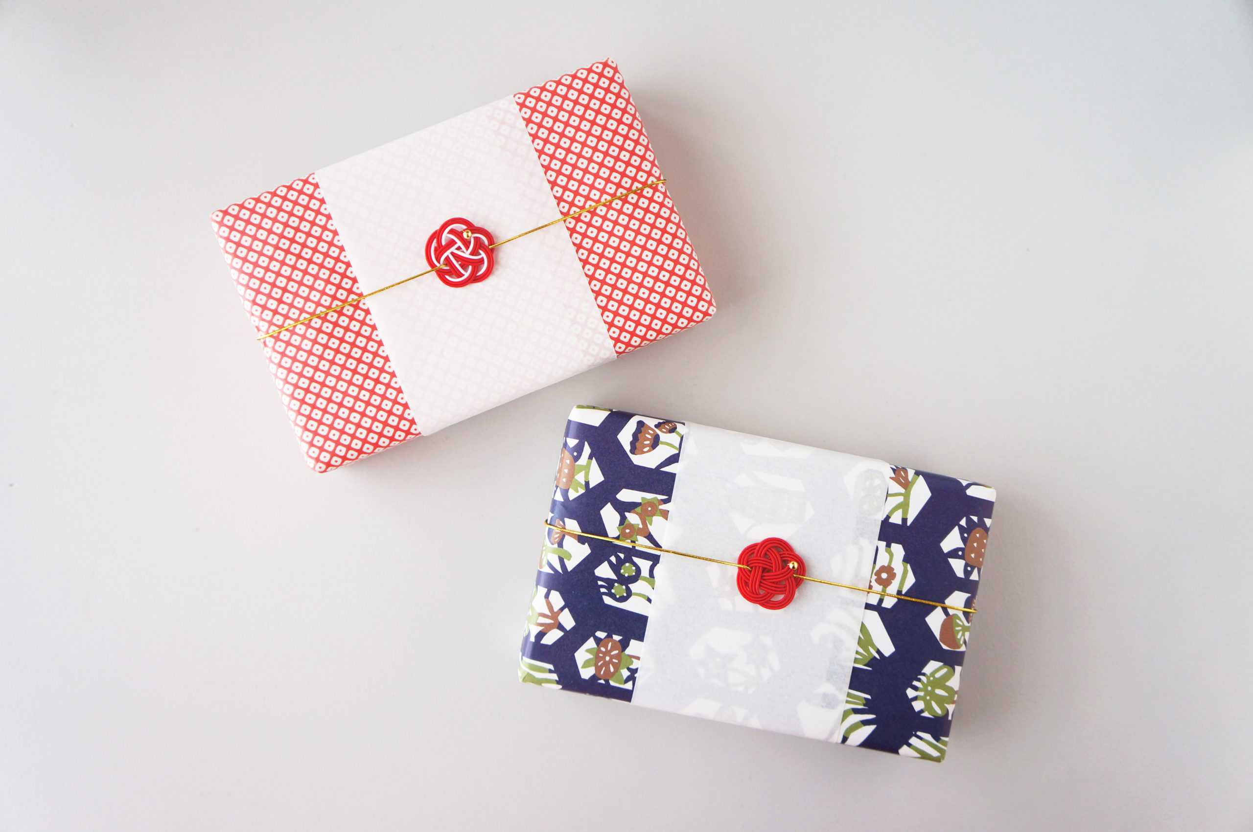 「起き上がりお人形様」を大切な人へプレゼントしたい方のために、ギフトラッピングをご用意しました。鹿の子柄(赤)とキッコウ柄(青)の2種類から、お好みでお選びいただけます。