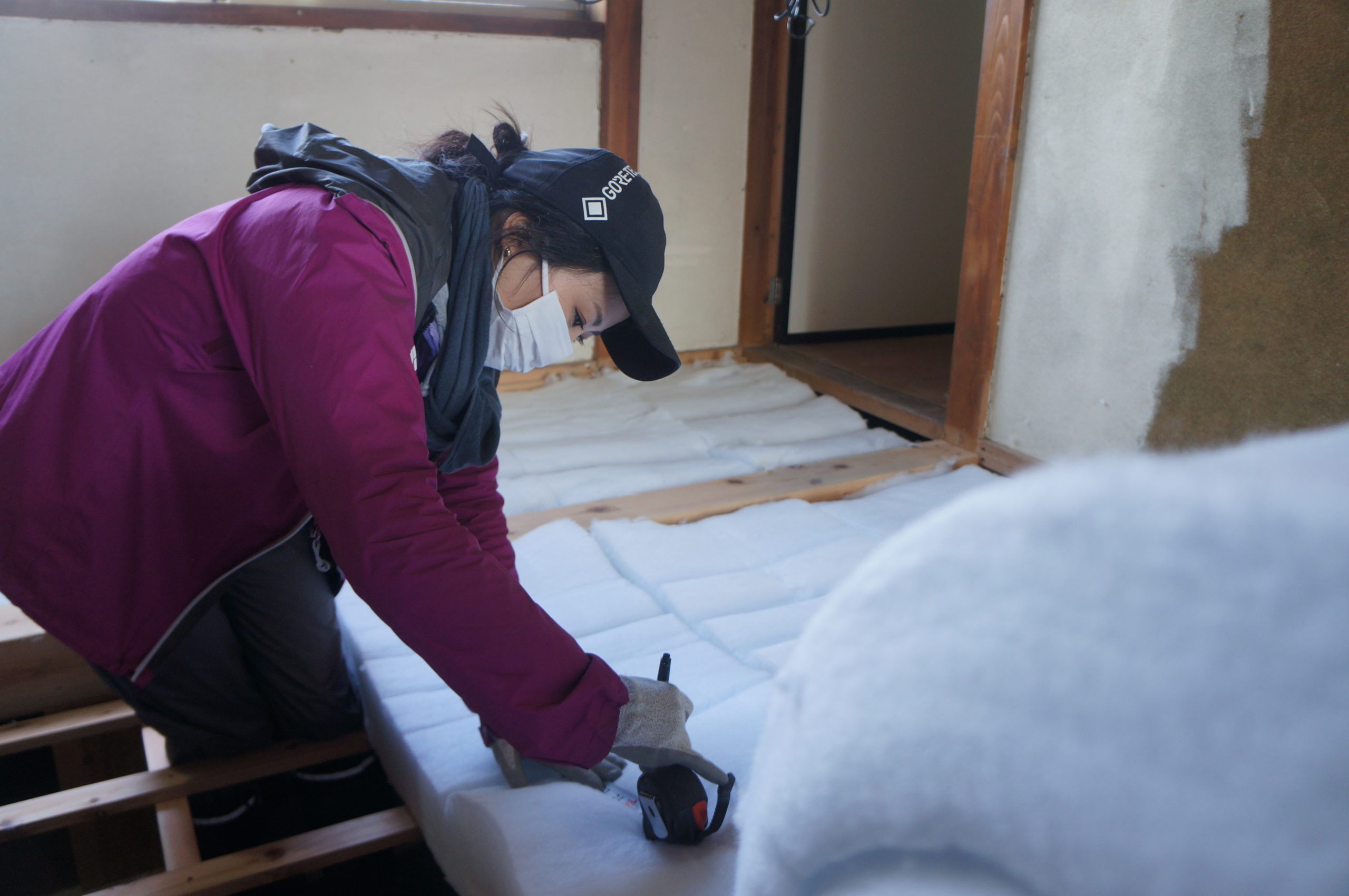 今日も、田村市常葉町にある空き家にて、作業を行いました。まずは断熱材を切って敷き詰めるところからスタート。パーフェクトバリアの断熱材は、ポリエステル100%でできていて、ふわっふわ!カッターや丸ノコでも切れますが、手でも綺麗にちぎれます。床一面に敷き詰めたら、ほわほわっと包まれるような暖かさを感じました。